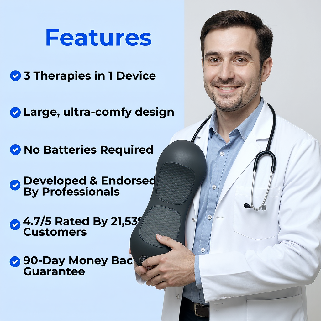 Each 15-minute session delivers a targeted combination of Medical-Grade Spinal Decompression, Deep Vibration Therapy, Therapeutic Heat, and precision pressure relief designed to release spasm at its source. As the device inflates, the therapy goes to work where pills and injections can't — helping exhausted muscles recognize they can finally let go so the shooting pain, numbness, and compression can finally settle.